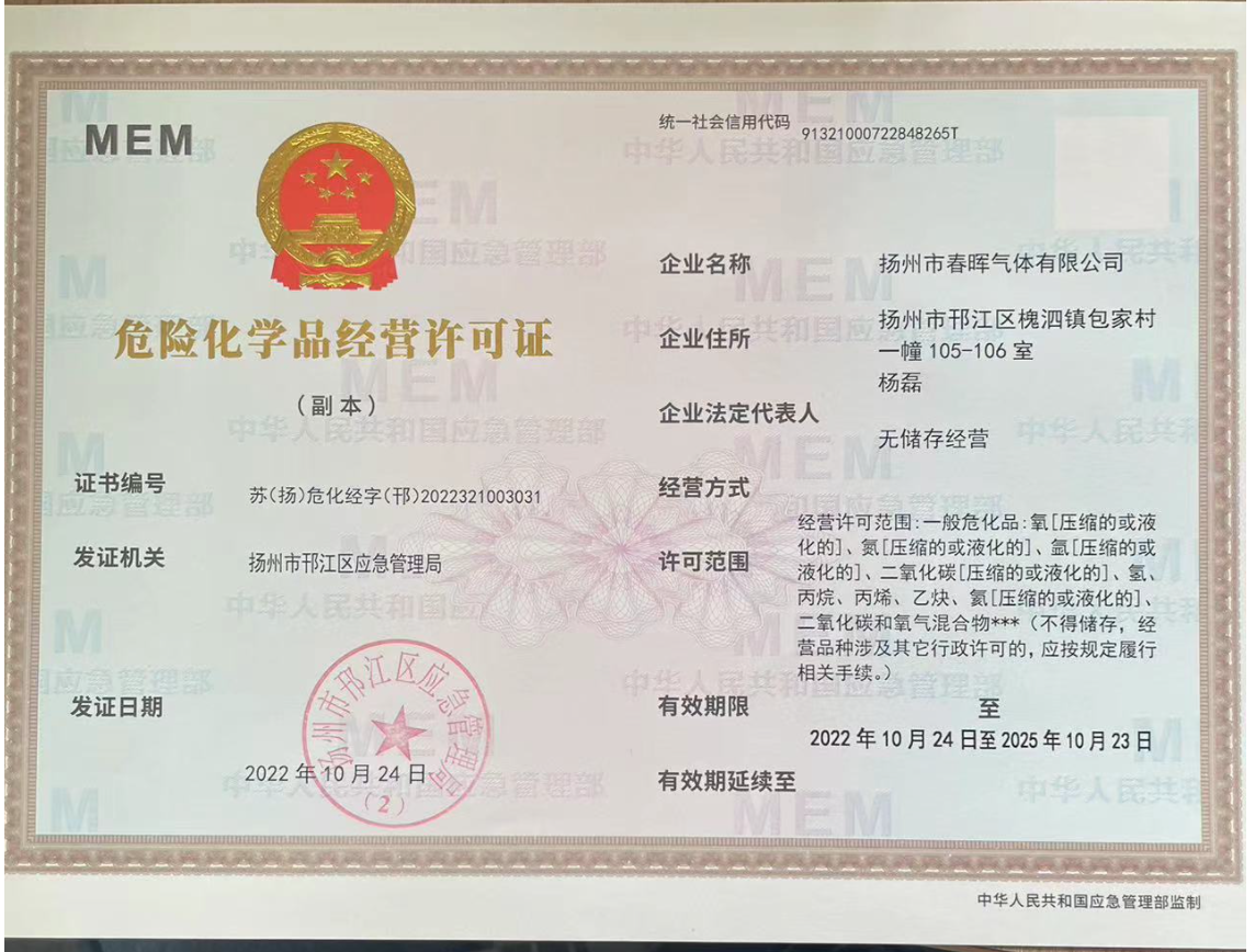 揚州市春暉氣體有限公司于1993年揚計經(93)技字第042號文批準生產工業氧氣、氮氣和二氧化碳。企業擁有固定資產3000多萬元,占地面積15000m2,建筑面積7000 m2,職工總人數68名,初級職稱人員10名,高級職稱人員2名,各種特種作業持證人員20名。 企業下設2個分公司及1個鋼瓶檢驗站。即春暉氣體有限公司酒甸分公司、春暉危險品運輸有限公司、無縫氣瓶檢驗站。主要生產經營產品有:液化及瓶裝氧、氮、氬、二氧化碳、乙炔、丙烷、液化天然氣、混合氣及各種高純氣體、干冰、鋼瓶...【查看更多】